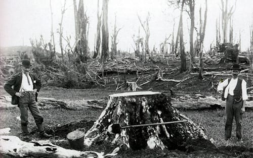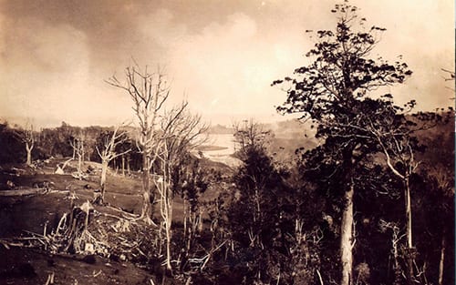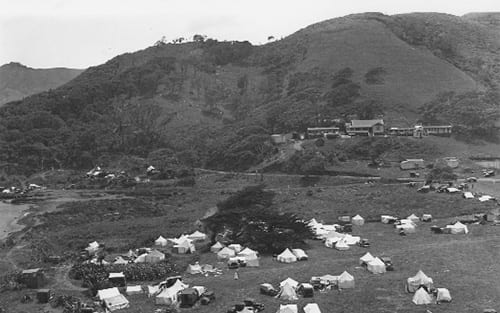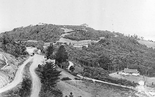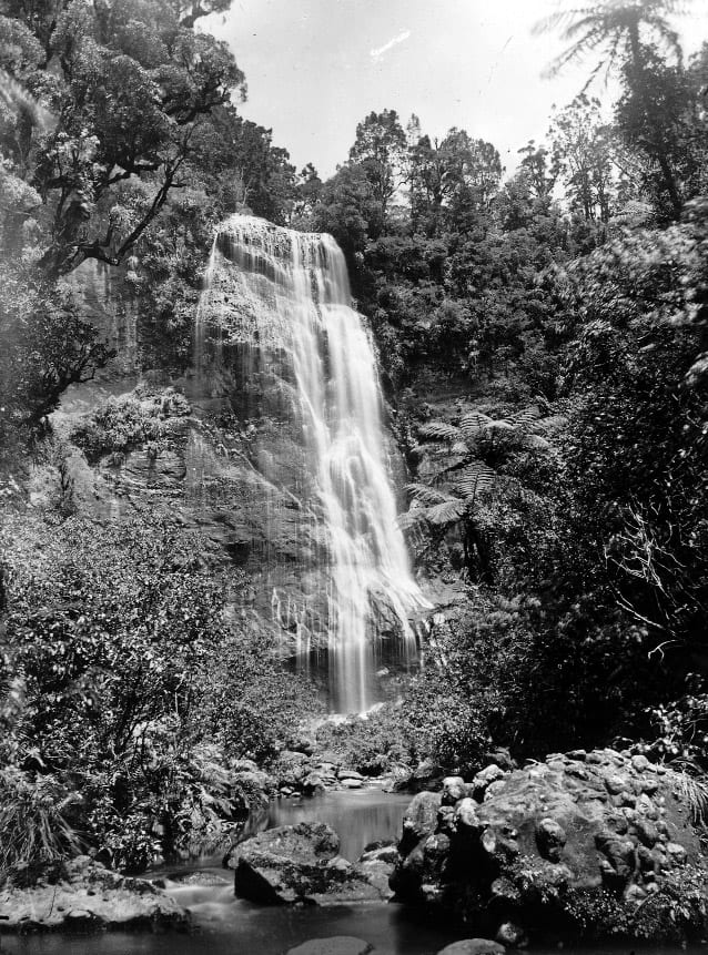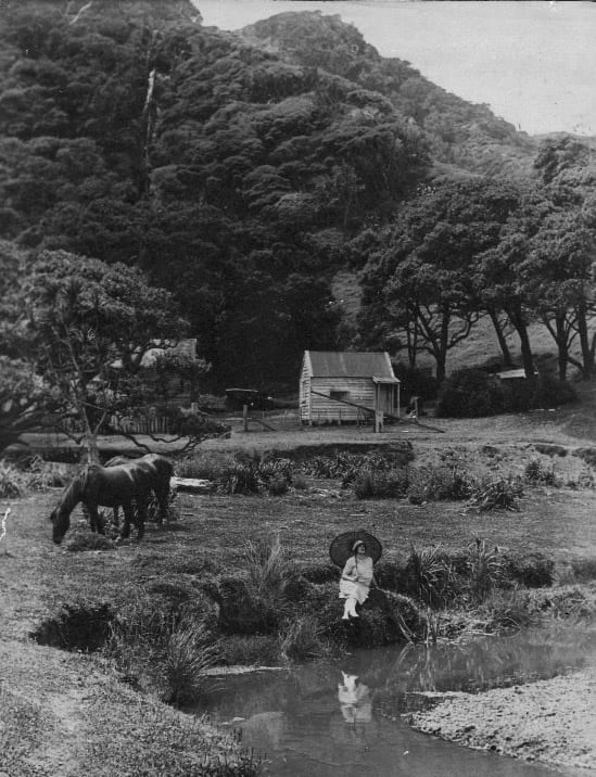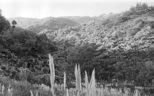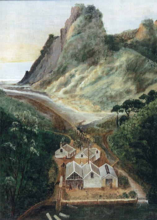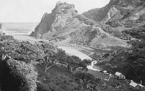 - Karekare 1916 with timber rail trestles and original mill houses. Bob Harvey collection